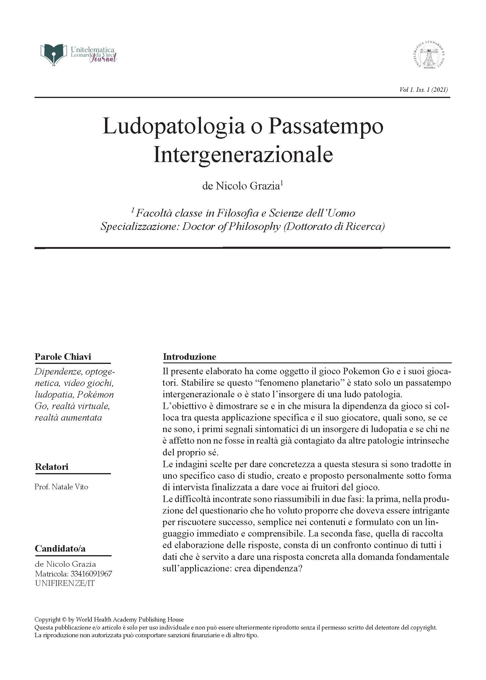 Il presente elaborato ha come oggetto il gioco Pokemon Go e i suoi giocatori. Stabilire se questo “fenomeno planetario” è stato solo un passatempo intergenerazionale o è stato l’insorgere di una ludo patologia. L’obiettivo è dimostrare se e in che misura la dipendenza da gioco si colloca tra questa applicazione specifica e il suo giocatore, quali sono, se ce ne sono, i primi segnali sintomatici di un insorgere di ludopatia e se chi ne è affetto non ne fosse in realtà già contagiato da altre patologie intrinseche del proprio sé. Le indagini scelte per dare concretezza a questa stesura si sono tradotte in uno specifico caso di studio, creato e proposto personalmente sotto forma di intervista finalizzata a dare voce ai fruitori del gioco. Le difficoltà incontrate sono riassumibili in due fasi: la prima, nella produzione del questionario che ho voluto proporre che doveva essere intrigante per riscuotere successo, semplice nei contenuti e formulato con un linguaggio immediato e comprensibile. La seconda fase, quella di raccolta ed elaborazione delle risposte, consta di un confronto continuo di tutti i dati che è servito a dare una risposta concreta alla domanda fondamentale sull’applicazione: crea dipendenza?