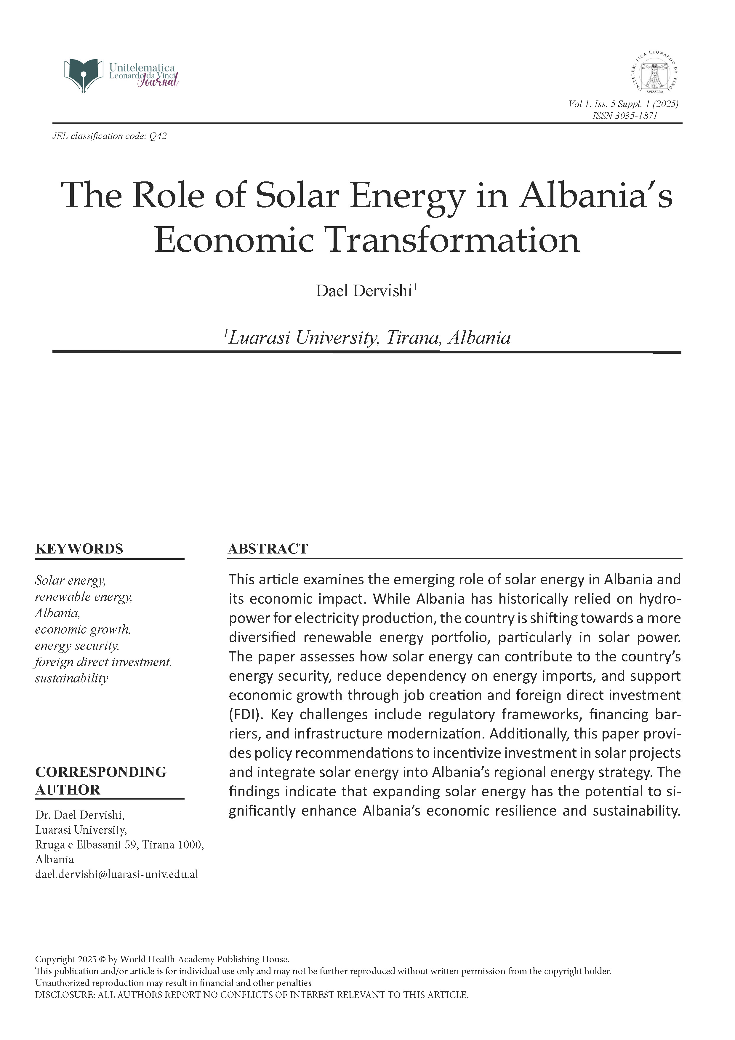 This article examines the emerging role of solar energy in Albania and its economic impact. While Albania has historically relied on hydro-power for electricity production, the country is shifting towards a more diversified renewable energy portfolio, particularly in solar power. The paper assesses how solar energy can contribute to the country’s energy security, reduce dependency on energy imports, and support economic growth through job creation and foreign direct investment (FDI). Key challenges include regulatory frameworks, financing bar-riers, and infrastructure modernization. Additionally, this paper provi-des policy recommendations to incentivize investment in solar projects and integrate solar energy into Albania’s regional energy strategy. The findings indicate that expanding solar energy has the potential to si-gnificantly enhance Albania’s economic resilience and sustainability.